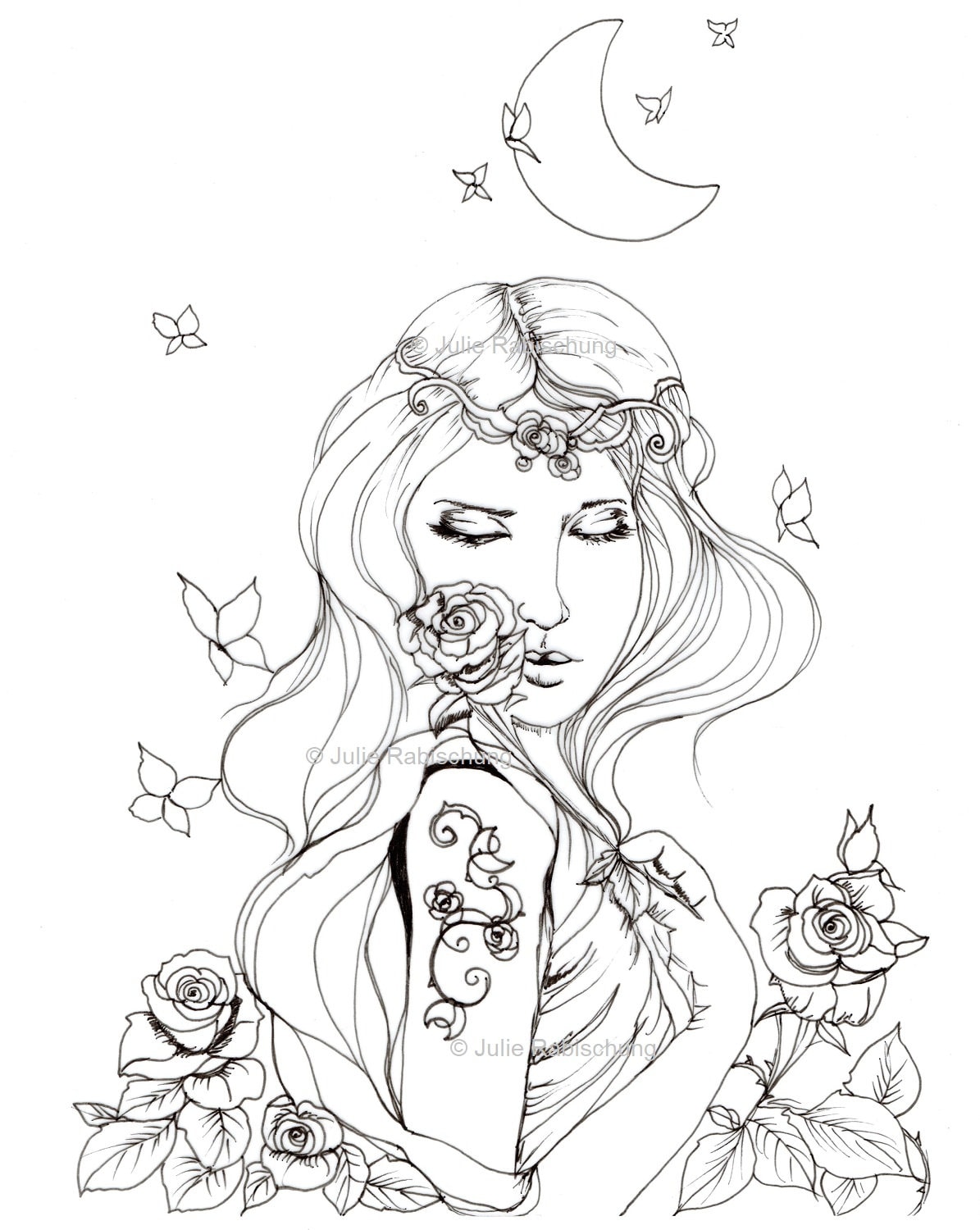 digital printable coloring page,woman portrait,roses,moon,tattoo,high resolution coloring page,adult coloring,black and white lineart